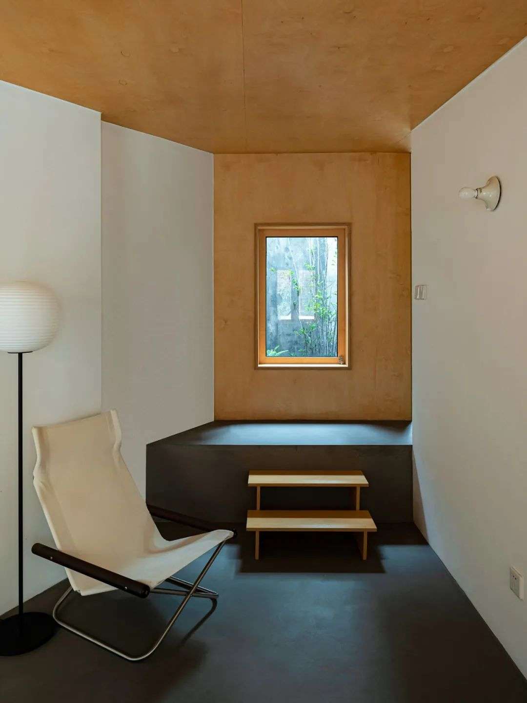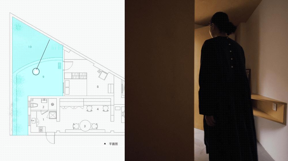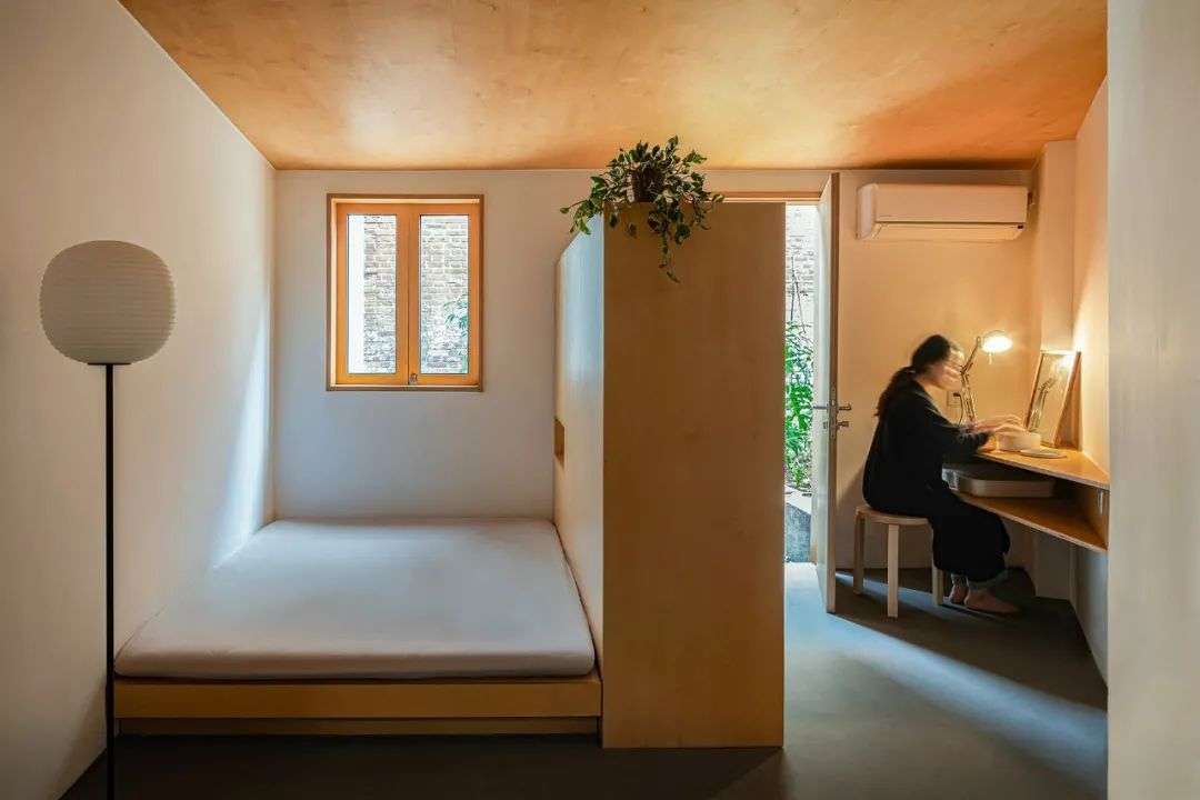 我把家乡老旧的烧火墩打磨后,拿来作为踮脚的木桩,穿过天井的三角区再下两节台阶,会有一种进入私密空间的仪式感。