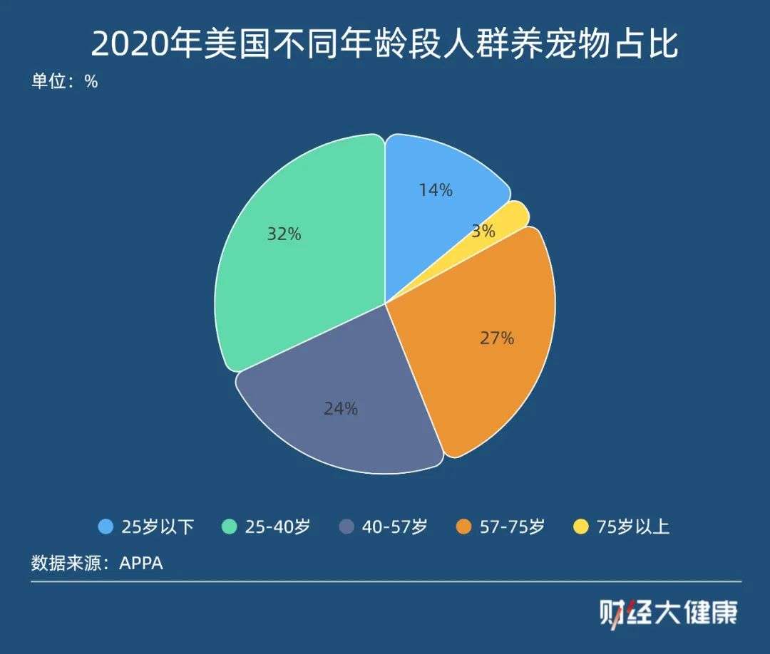 美国宠物用品行业协会的一项统计数据显示, 2020年,美国养宠物的人群中,占比最大的人群为25岁—40岁,占32%。 而18岁—34岁的人群中,会有超过一半的人把宠物看作孩子,他们愿意为“孩子”花更多的钱。