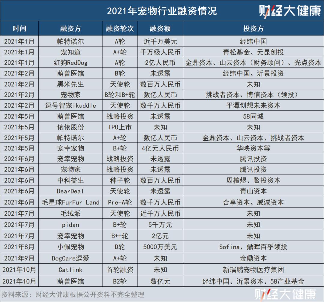 对未来市场的看好,使得这几年资本对宠物市场青睐有加。 今年10月,萌兽医馆已完成B2轮融资,获数亿元注资。 据《财经》不完全统计,这已经是2021年以来,宠物行业的第23次融资,总融资金额近20亿元。