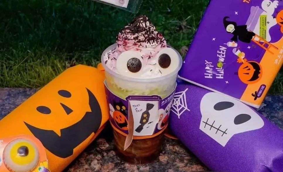 沪上阿姨上新限定捣蛋抹茶魔法冰,顶部用巧克力做出眼睛的形状;同时推出万圣节周边捣蛋包“,糖果造型的外观,内含跳跳糖、眼球软糖、限定款纸巾口罩。