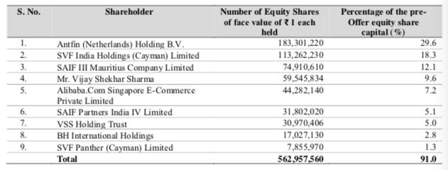 根据招股书,IPO前,蚂蚁集团旗下Antfin (Netherlands) Holding B.V.持股为29.6%,阿里巴巴间接持股7.2%,SVF India Holdings (Cayman) Limited持股为18.3%,SAIF III Mauritius Company Limited持股为12.1%,创始人持股为9.6%。除了阿里巴巴之外,伯克希尔哈撒韦、软银都是Paytm的股东。
