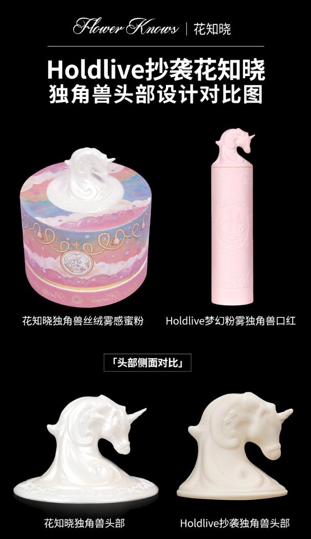 2020年12月4日,花知晓在官方微博上指控品牌Holdlive抄袭其独角兽系列产品的外观,“Holdlive梦幻粉雾唇膏”使用了“花知晓独角兽丝绒雾感蜜粉”相似的独角兽头设计造型。