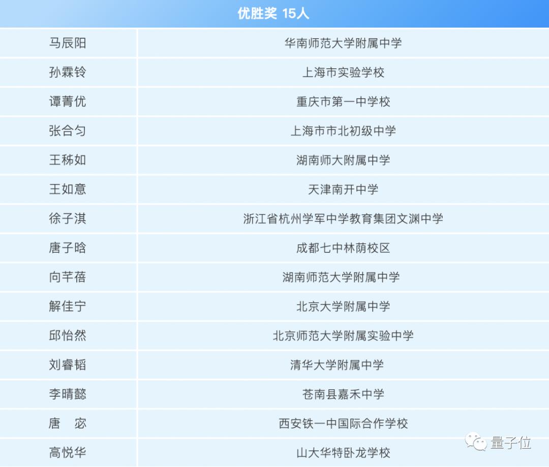 此外还有优胜奖15人,可以注意到其中也有一位来自成都七中的唐子晗同学。