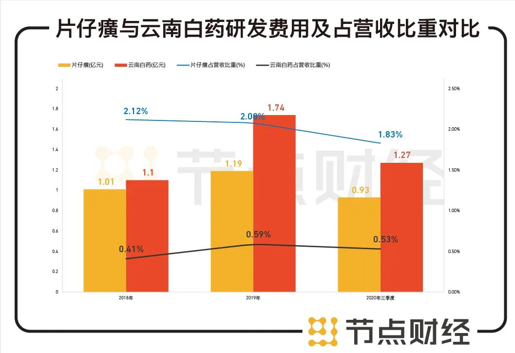 但是作为中药行业的两大巨头,对于产品的研发投入却很吝啬,片仔癀2018年、2019年和2020年三季度的研发费用分别为1.01亿元、1.19亿元、0.93亿元,占营收的比重分别为2.12%、2.08%、1.83%。相对应时间段云南白药占营收的比重分别为0.41%、0.59%、0.53%。一直都在吃老本的行为,让云南白药和片仔癀止步不前,因为没有更加强劲的竞争对手出现,整个行业的发展极其缓慢。