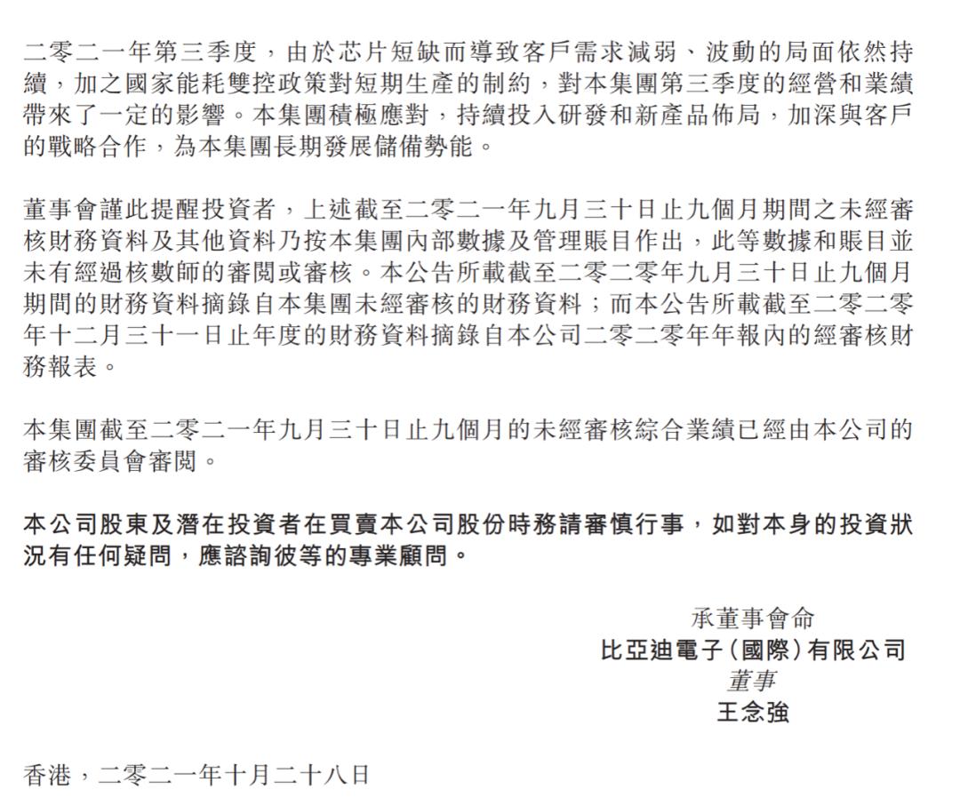 比亚迪电子在业绩报告中也表示,“由于芯片短缺而针对用户需求减弱、波动的局面依然持续,加之国家能耗双控政策对生产的制约,对本集团第三季度的经营和业绩带来了一定的影响”。
