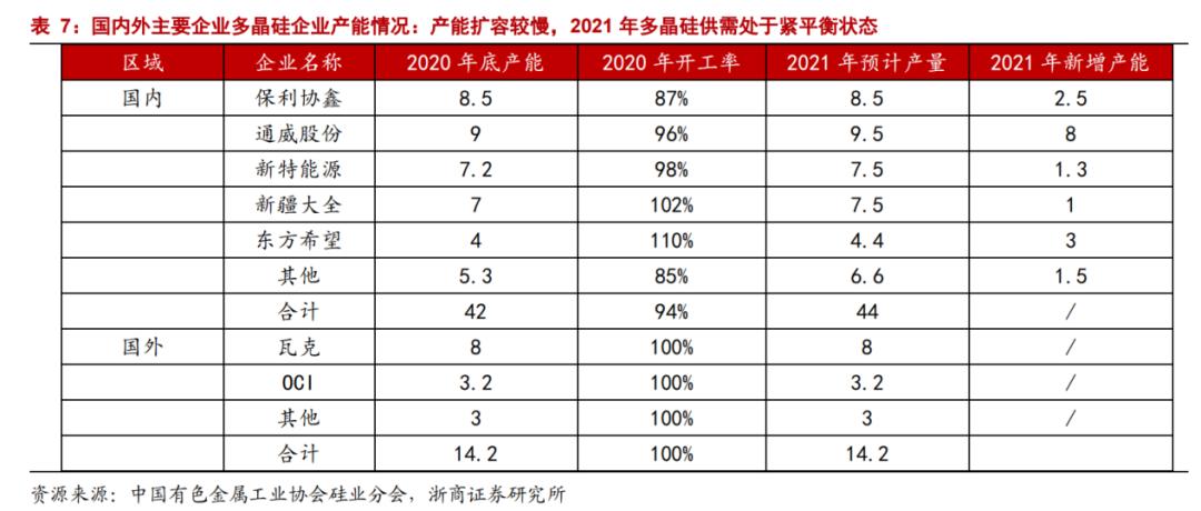 需求端,据CPIA 预测2021年全球光伏新增装机量将达到150-170GW,折合硅料在54-61.2万吨,全球硅料企业满产才能达到预期。