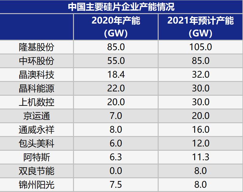 “双龙头”隆基股份和中环股份,分别计划2021年产能达105GW和85GW,晶澳科技、晶科能源、上机数控均计划产能达标30GW,其他企业也均不同程度的扩产。