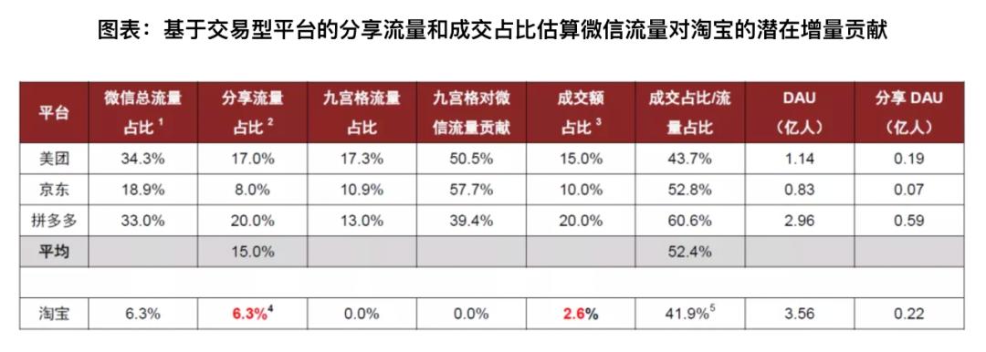 微信开放外链前夕,中金研究曾经测算过淘宝、美团、京东、拼多多等交易平台在微信上获取到的分享流量及交易额,发现微信对淘宝的流量和交易额贡献增量分别为6.3%和2.6%。相比之下,美团、京东、拼多多的微信总流量占比分别为34.3%、18.9%和33%。如果微信如阿里所愿完全对淘宝开放,这一12亿用户的富矿将大大缓解其“流量饥渴症”。