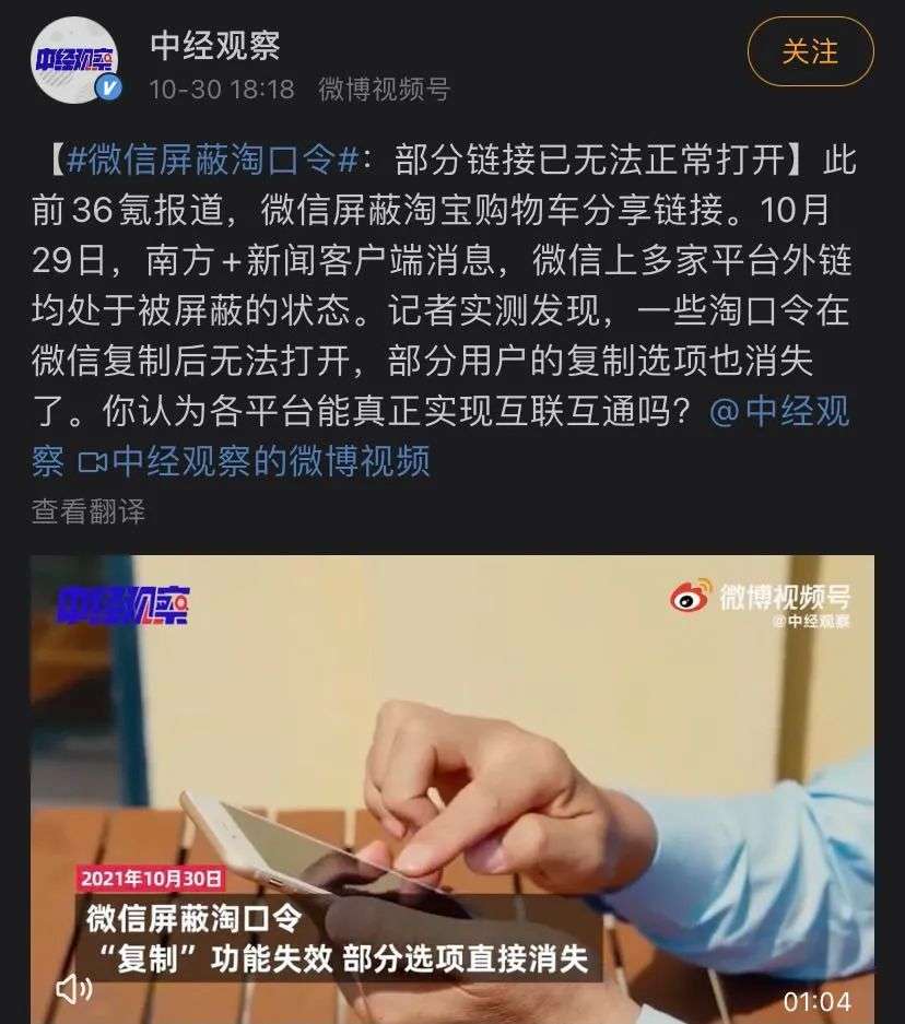 然而,阿里“攻城”的第二弹却并不顺利。早在双十一前两个月,阿里就放出风声:双十一淘宝购物车可一键分享到微信了,“熟人种草”时代从此开启。然而27号上线分享购物车功能后,媒体和用户却发现“此路不通”。不仅如此,甚至一些淘口令在微信复制后无法打开,部分用户的复制选项也消失了,#微信屏蔽淘口令# 也在10月30日再一次登上了微博热搜。换言之,微信的大门不仅没有进一步打开,反而连仅有的一条缝也关得更严了。