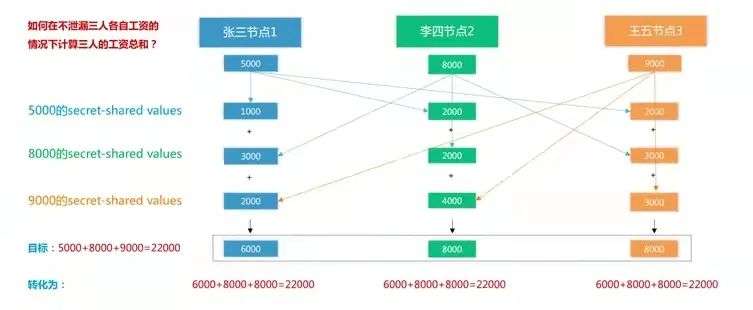 例如:因业务所需,A希望了解客户张三、李四、王五的工资总和。如果使用传统方式,A需要从张三、李四、王五节点直接采集数条工资记录,然后求和,但实际A对个人信息处理的目的只是想了解三人的工资总和,采集工资记录并没有做到《个保法》下最小必要原则。