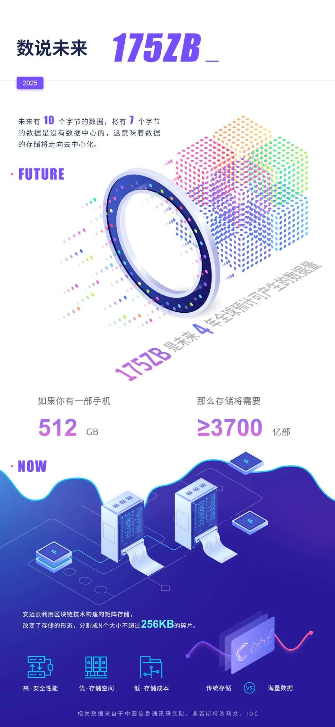 如此一来,全球数据存储局势或将发生逆转,去中心化存储将逐渐成为市场选择的主流。数据显示,未来四年全球预计将产生175ZB的数据量,相当于3700多亿部512GB手机的存储量。而根据相关机构的测算,未来每10个字节的数据,将有7个字节的数据是没有数据中心的,这就意味着去中心化存储将成为数据存储的主要发展方向。