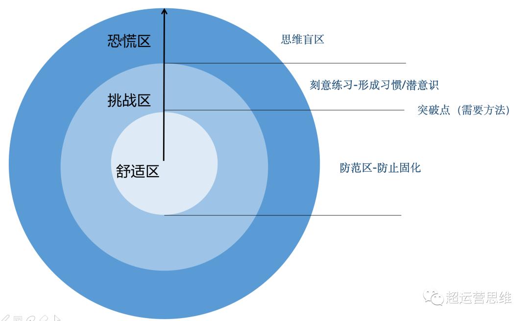 对于初级运营,高级运营的潜意识思维习惯,就是其思维舒适区的边界,需要向上突破和刻意练习后才可以进阶。而对于高级运营,跳出阶段或者具体思考,站在整体或者全局来进行思考时就会成思维舒适区的边界,需要去突破。