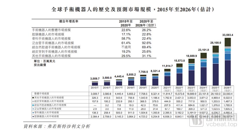 根据招股书里的弗若斯特沙利文的数据,全球手术机器人市场按照市场规模排序,可以分为五大市场:腹腔镜手术机器人市场、骨科机器人、泛血管机器人、经自然腔道手术机器人、其他手术机器人市场。