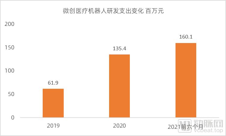 产品临床推进和对外买买买让微创医疗机器人的研发支出也水涨船高。2021年前六个月的研发支出达1.6亿元,超过了2020年全年的研发投入。同时,微创医疗机器人的亏损也逐步扩大。2019年、2020年和2021年前六个月的亏损分别为6980万元、2.09亿元和2.42亿元。