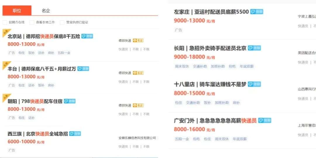 翻看招聘平台,相关的快递员招聘公告暴增,从标题里都能看得出十万火急:“急急急急急急招高薪快递员”、“全城急招”、“月薪过万”、“配车住宿”,甚至有的招聘标题写着“骑车溜达赚钱不是梦”。