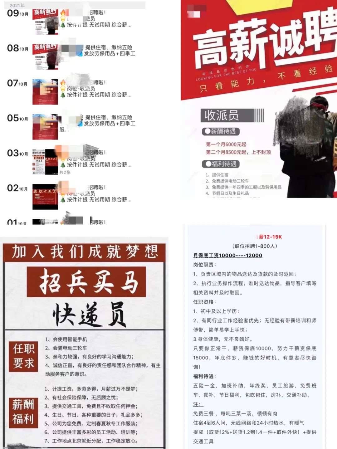 有快递从业者从2021年9月底就开始持续在朋友圈发布招聘公告,其中提到提供住宿、按件计提、无试用期、综合薪资8K-15K、无需打卡,免费提供交通工具且不收押金,发放劳保用品和四季工服,生日、节日礼品多多。