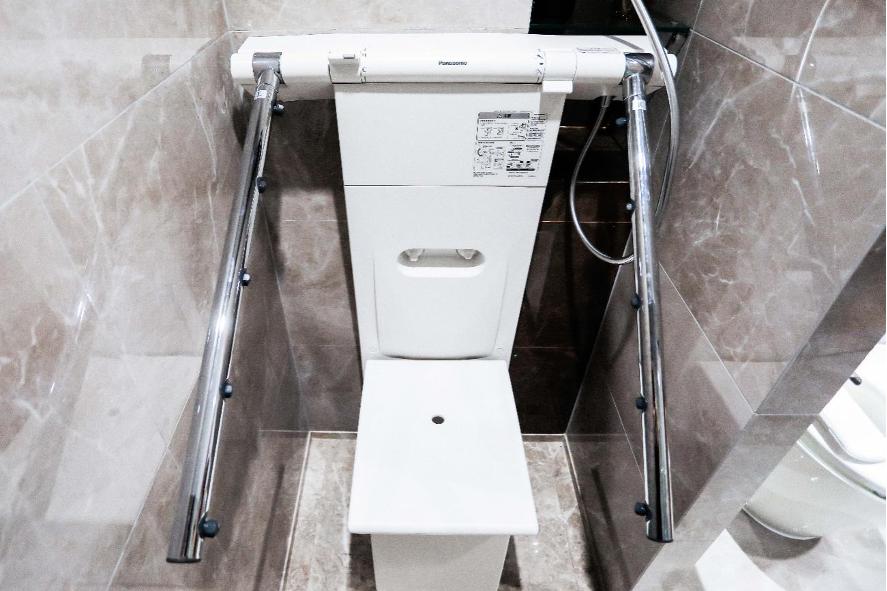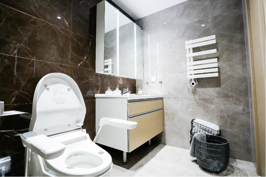在健康寝室的旁边,我们看到了配备坐式淋浴和健康一体机的智能化卫浴空间。其中的健康一体机为用户提供了一系列身体健康指数的测量功能,并通过指纹识别对家中不同成员的信息记录归档,让居住者可以更全面地了解自己和家人的身体状况,帮助健康管理,进而实现“防治未病”。