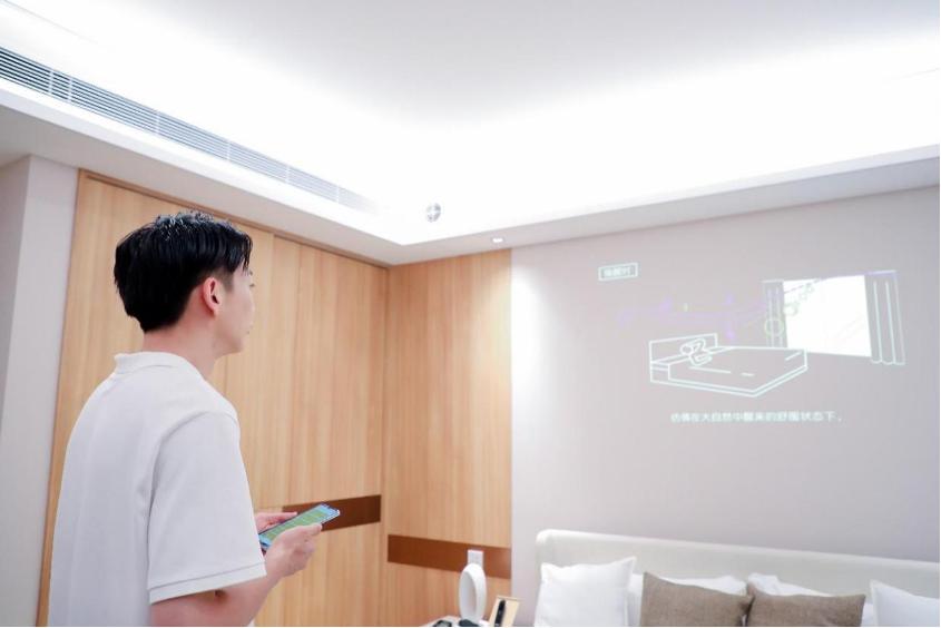 健康寝室的核心功能来自一整套深眠爽醒系统,通过对室内的温度、照明和声音等进行控制,帮助用户改善睡眠质量。夜晚,系统会在适当时间关闭自动窗帘并将室内灯光缓慢熄灭,帮助营造入睡环境,还会配合季节、根据用户的睡眠状况调整室内温湿度,帮助用户在整个睡眠过程中保持舒适的状态;到了早晨,窗帘和灯光会自动打开,同时播放鸟鸣等白噪音和轻音乐,让用户以自然的方式逐渐醒来,避免被闹钟惊醒的刺激和紧张感。