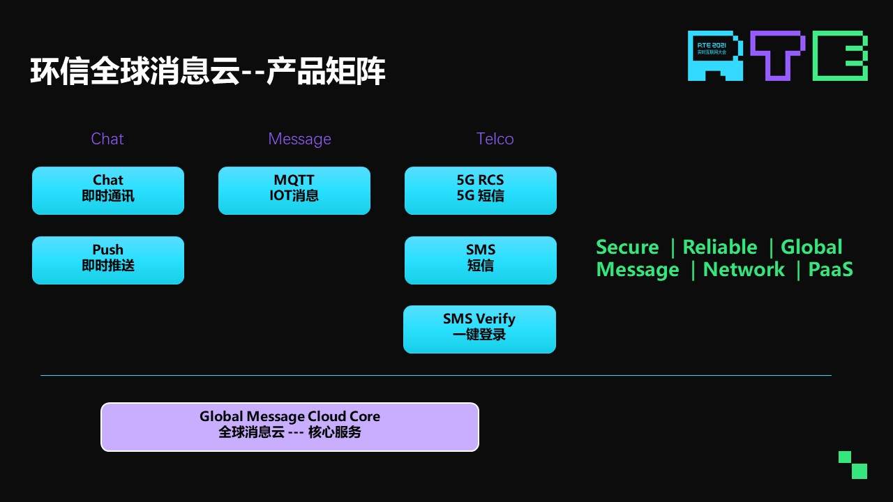 在实时互动的过程中,实时音视频和IM文字消息都是非常关键的功能,在今年1月,声网正式收购了环信,为RTE产品组合增加了IM这一关键的产品能力,此次Product Channel,环信也发布了“全球消息云“。