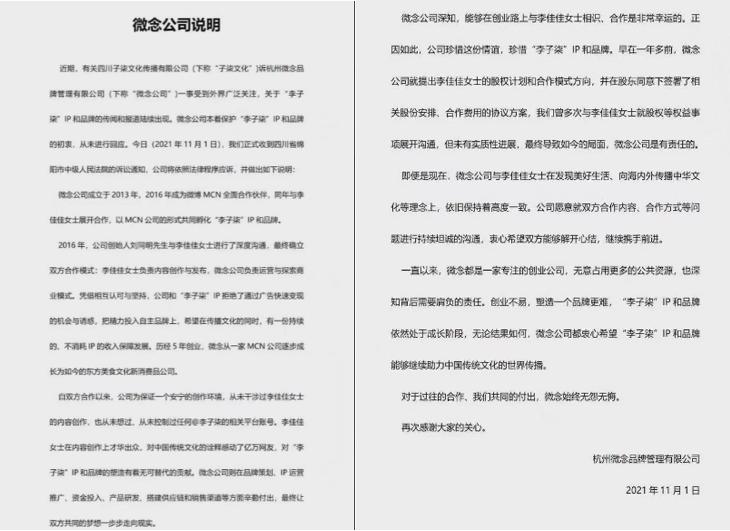 李子柒上诉后,其与微念的股权纷争在网上闹得沸沸扬扬。11月1日,涉事方微念终于作出了回应,称此前不回应的初衷是保护“李子柒”IP和品牌。这一回应也坐实了双方发生股权纷争的传闻。