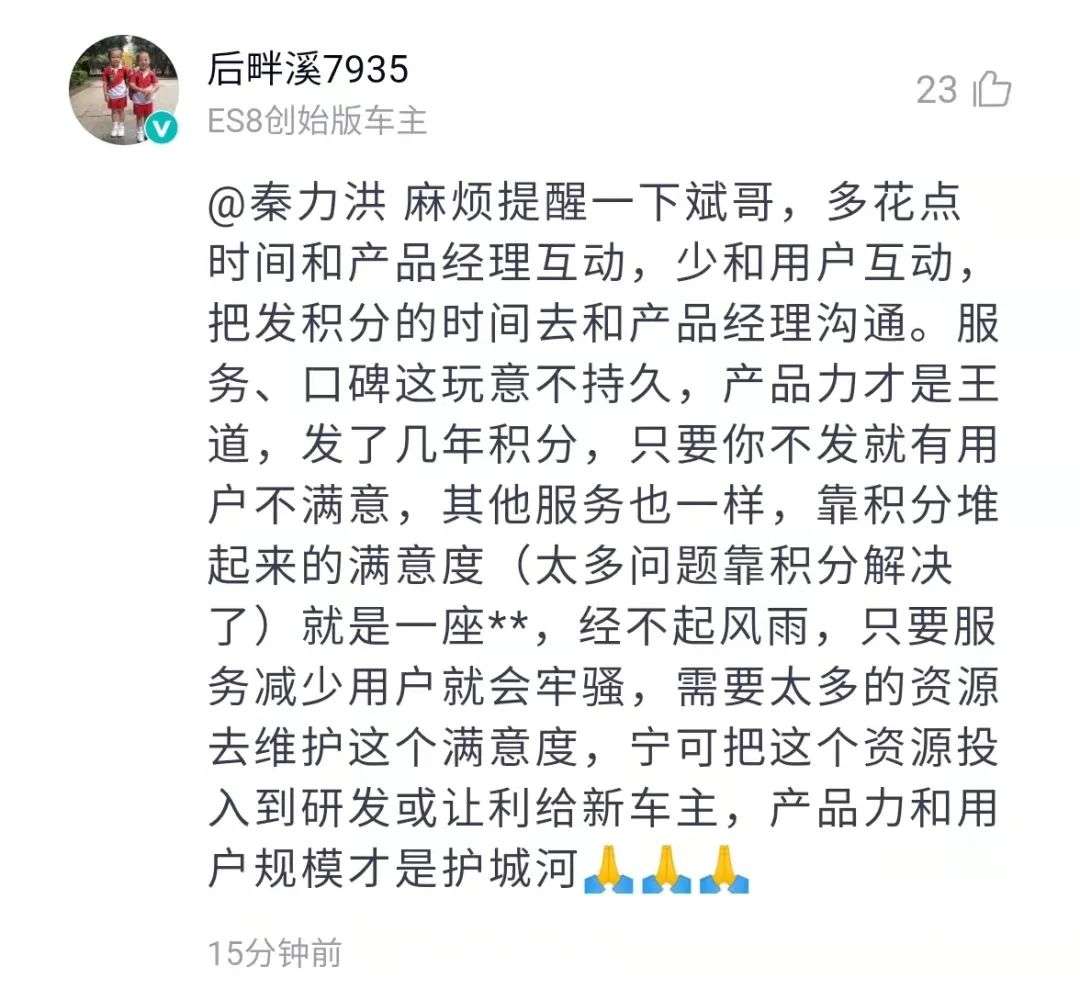 有用户建议道,产品力和用户规模才是护城河,“靠发积分堆起来的满意度经不起风雨,(如果)需要太多资源维护满意度,宁可把资源投入到研发或让利新车主”。