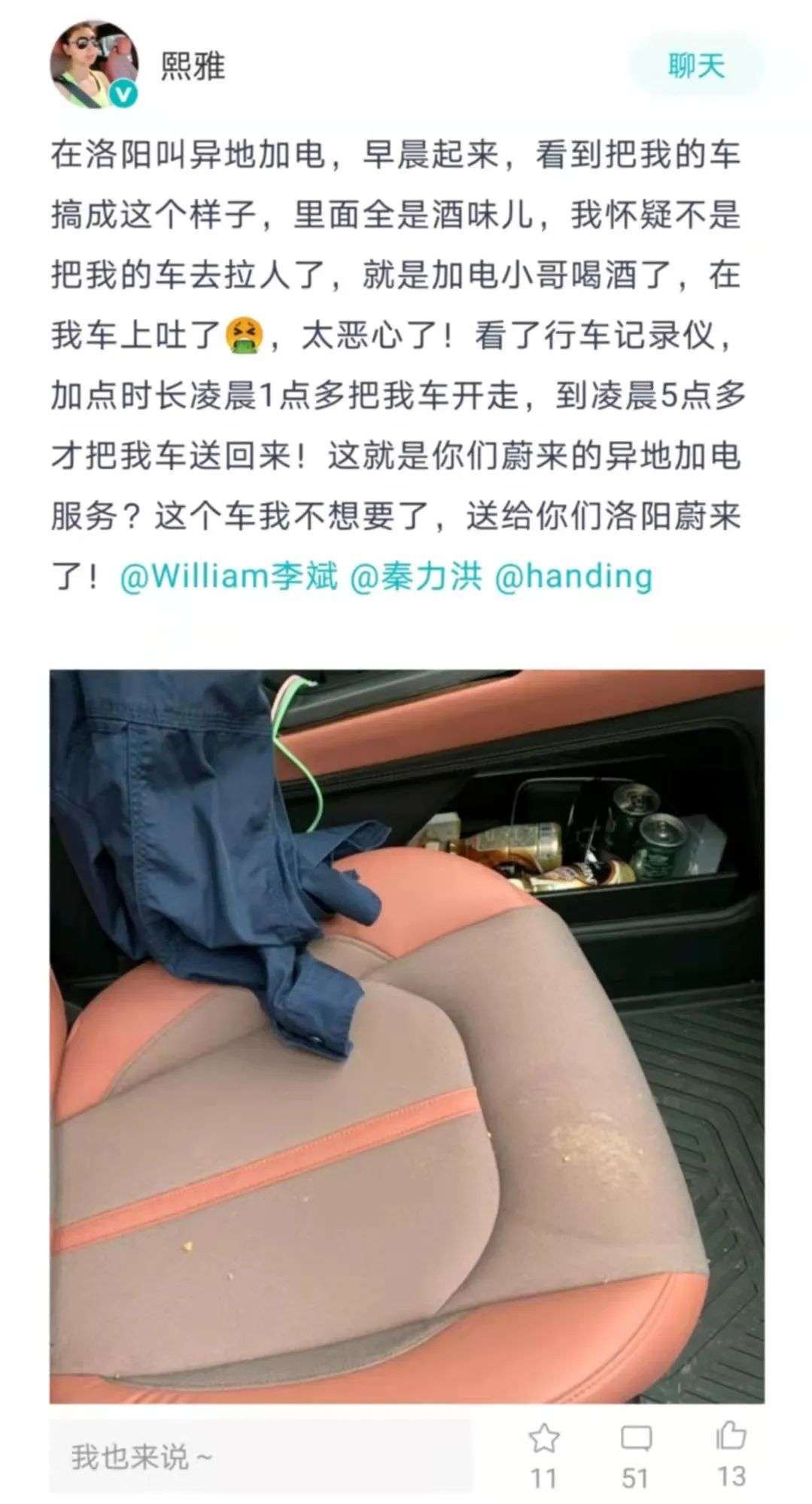 国庆自驾游最后一天,熙雅落脚至河南洛阳,由于所驾驶的蔚来EC6电量不多了,熙雅在凌晨呼叫了蔚来的异地加电服务。令她始料未及的是,车子被专员送回来后,她发现车内充满了酒气、副驾驶位疑似有呕吐物印记、脚垫有呕吐物。“整个旅行计划被打乱,也没什么心情了。”