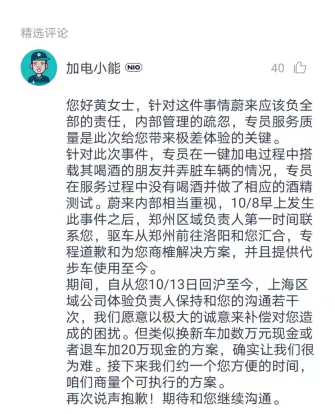 针对熙雅的要求,蔚来工作人员在评论区回应称,这件事情蔚来应该负全部责任,内部管理的疏忽,专员服务质量(不足)给用户带来极差的体验。但蔚来方面同时也表示,类似换新车加数万元现金或者退车加20万现金的方案,“确实让我们很为难”。