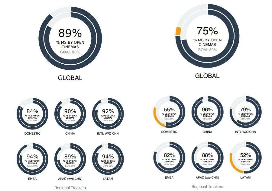 在影院复工率方面(以2019年12月31日尚在营业电影院数为基准),目前的数据也是遥遥领先去年同期。目前全球已经有89%的影院得以复工。其中北美影院复工率已经达到了84%,相比去年同期55%的成绩增长迅速。除此之外,欧洲、东亚、东南亚以及拉美国家的影院复工率都实现了不同程度的增长。在这个数据对比之下,中国反而成为了唯一影院复工率下跌的市场,去年同期还能有96%的影院正常营业,目前已经下跌至90%,而因为数据统计在10月24日,预计目前中国的影院复工率还要更低。