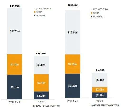 虽然这个数据不及疫情前平均340亿美元的成绩,但是已经相比2020年同期94亿美元票房增长达到72%。在这162亿美元中,中国市场恢复最快,取得了64亿美元的成绩,相比往年恢复程度已经达到83.1%。而除北美和中国以外其他市场,也贡献了68亿美元的票房成绩。
