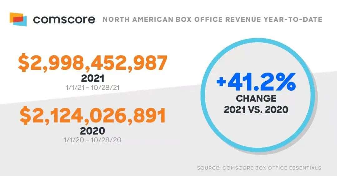在疫苗普及的助力下,北美电影市场相比2020年同期,也实现了40%以上的增幅,考虑到11-12月北美影市还有《永恒族》《捉鬼敢死队》《魔法满屋》《蜘蛛侠:英雄无归》《西区故事》《黑客帝国4》《王牌特工:源起》等重磅项目公映,而去年同期仅有一部院网同步的《神奇女侠1984》,这一增幅甚至有望提升至60%以上。