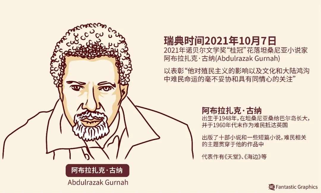 10月7日,瑞典文学院将2021诺贝尔文学奖授予原籍坦桑尼亚的作家古尔纳,理由是“鉴于他对殖民主义的影响以及文化与大陆之间的鸿沟中难民的命运的毫不妥协和富有同情心的洞察”。