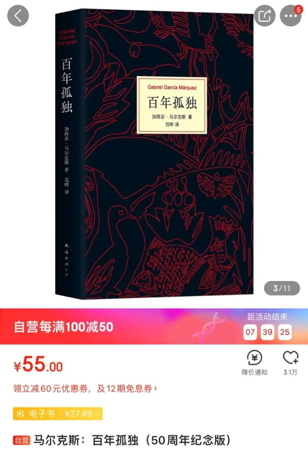 ▲今年双11,新经典文化发行的中文正版《百年孤独》在某电商平台打5折