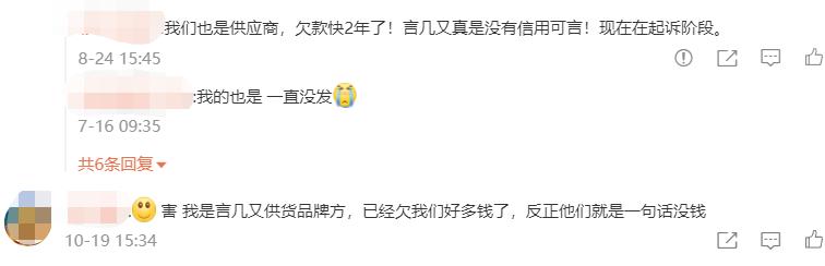 实际上,言几又拖欠的不止员工工资,不少供应商也被欠货款数个月到一两年不等。