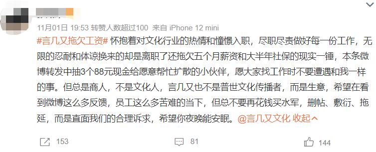 11月1日,多名网友在微博反应,言几又拖欠员工数月工资和社保,甚至有员工电话直接被HR总监拉黑了。从一些离职员工给出的信息中可知,言几又从年初就开始拖欠薪资,至今没有解决。