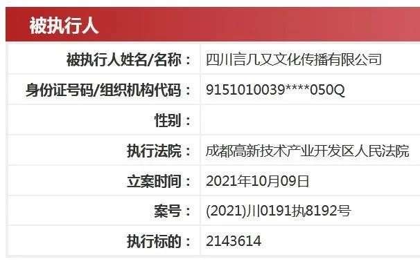 10月9日,四川言几又文化传播有限公司再新增被执行人信息,执行标的214.36万。
