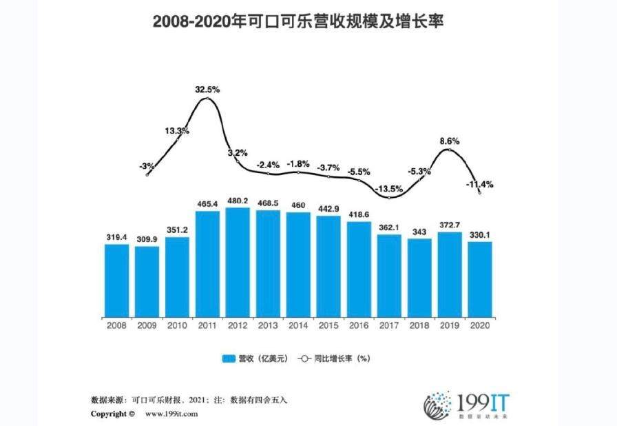 可口可乐大部分饮料销量来自其碳酸饮料业务,消费趋势改变,可口可乐业绩也受到影响。自2012年营收到达高峰480.2亿美元,可口可乐近几年营收持续地走低。2020年可口可乐全年营收为330亿美元,距最高点已经下滑了约150亿美元的销售额。