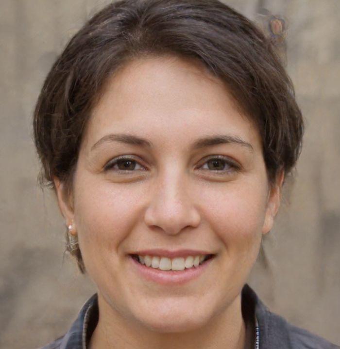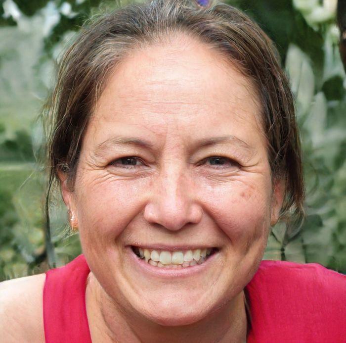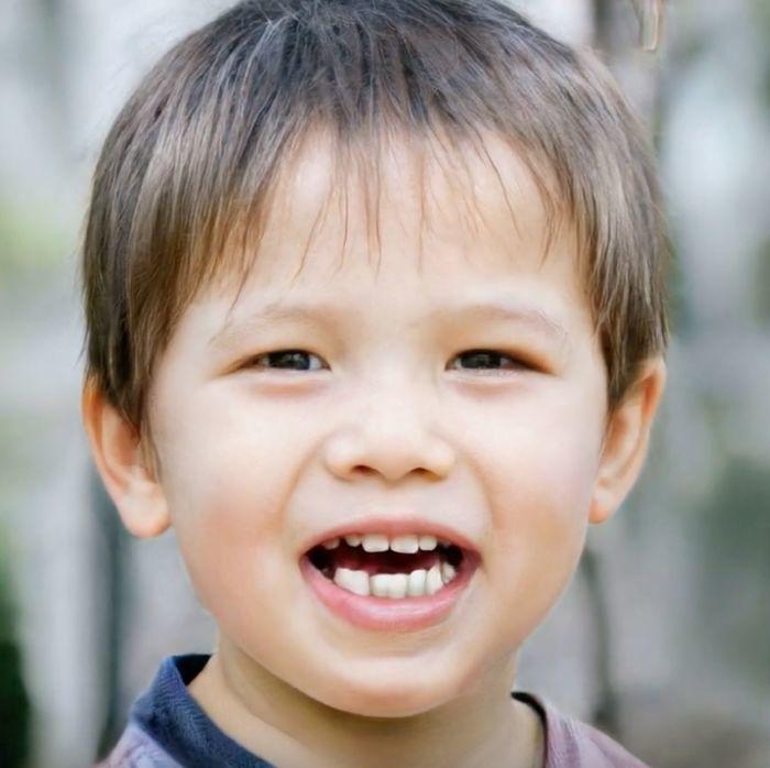 下面这张图可能稍微难辨别一点,但如果你仔细看她的牙,会发现她中间第三颗牙异常地小,而且耳朵也非常不自然,所以这也是一张生成的假头像。