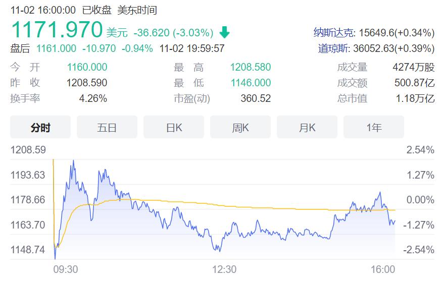 特斯拉盘中一度跌超5.18%,收盘跌3.03%,市值跌破1.2万亿美元,蒸发368.71亿美元,约合2360亿人民币。