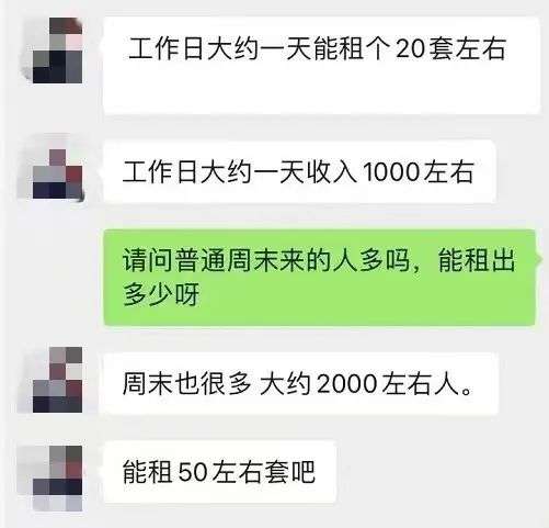 按照工作日50元一套一小时计算,一个出租太空服的商贩,保底最低收入是一天1000元,在周末,能收入2500元一天,更不用说中秋国庆等节假日,每套太空服每小时都被租用,最饱和情况下,一天的收入能达到一万元以上。