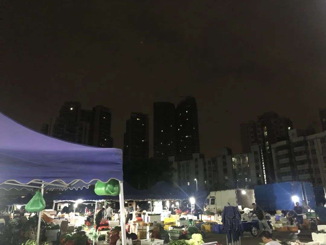 此时若是从夜空往下俯看,只有一块占地约8万平方米的空地灯火通明。这块空地是深圳某农产品批发市场,承担着方圆十几公里内居民和零售菜场的每日需求。
