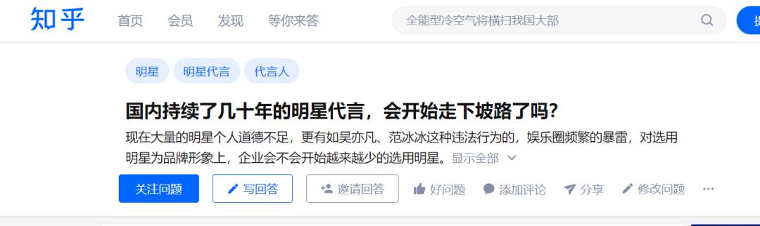 在知乎上也有人提出提问:国内持续了几十年的明星代言,正在开始走下坡路了吗?有人指出,因为流量明星代言费用高企,加之许多明星在道德层面的问题极易暴雷,品牌对于选用明星代言开始慎之又慎。