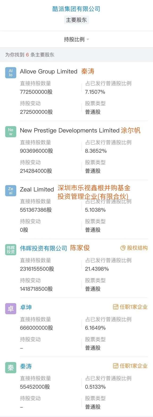 酷派的四股东是卓坤,持有酷派6.1649%的股份,笔者未查询到卓坤的信息,有网友表示其与酷派大股东陈家俊是一致行动人。