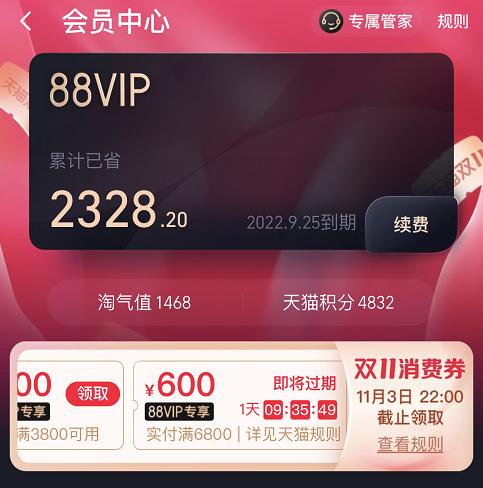 早在10月26日,天猫就公布了iPhone 13系列的优惠活动:假设你是88VIP用户,就可以到88VIP专属版块领取一张满3800元减300元和一张满6800元减600元的优惠券,不过只能在11月1日到3日这几天使用。