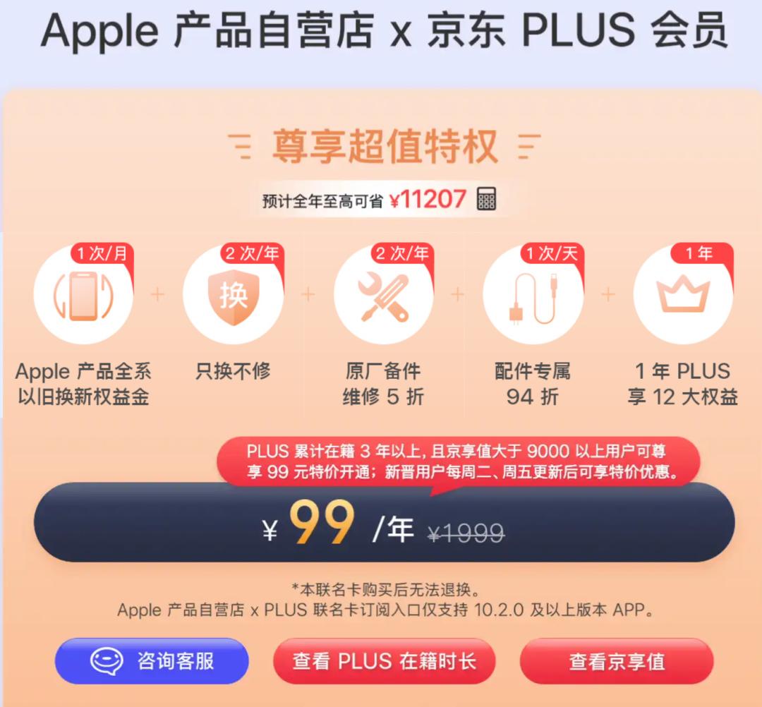 另外京东还针对拥有旧款iPhone的用户开通了了Apple产品自营店xPLUS联名卡(简称京A卡),开通后可享Apple产品全系以旧换新尊享权益金、每天可以领取一张配件94折券,1年2次只换不修服务,1年2次原厂备件5折优惠以及赠送1年京东PLUS会员卡。除此,以旧换新还能享额外补贴。不过想要开通该服务有一定难度,用户先需查询自己是否满足要求。