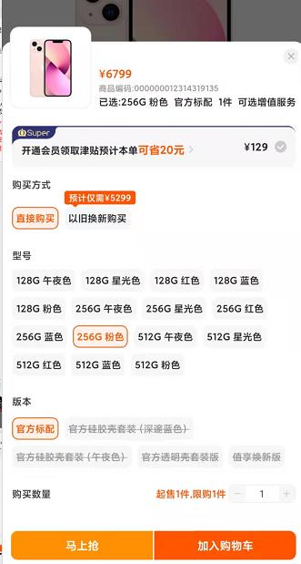 iPhone 13作为出货量最大的一款产品,拼多多为其提供了三个等级的优惠,128G版本可优惠600元(含界面300元优惠卷以及百亿补贴满5000-200优惠卷),到手价为5399元,与天猫88VIP持平。256G版本和512G版本分别优惠800元和1500元,到手价为5999元和6899元。