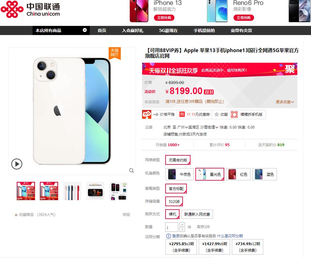 除开苹果官方旗舰店,像中国移动/联通官方旗舰店也给出了不小的优惠活动,在11月1日至11月3日,用户除了可采取前文提到的凑单方式外,还可以叠加移动/联通手机号用户专享100元优惠,128G版本最低到手价为5299元(需凑单),256G版本到手价为6099元。