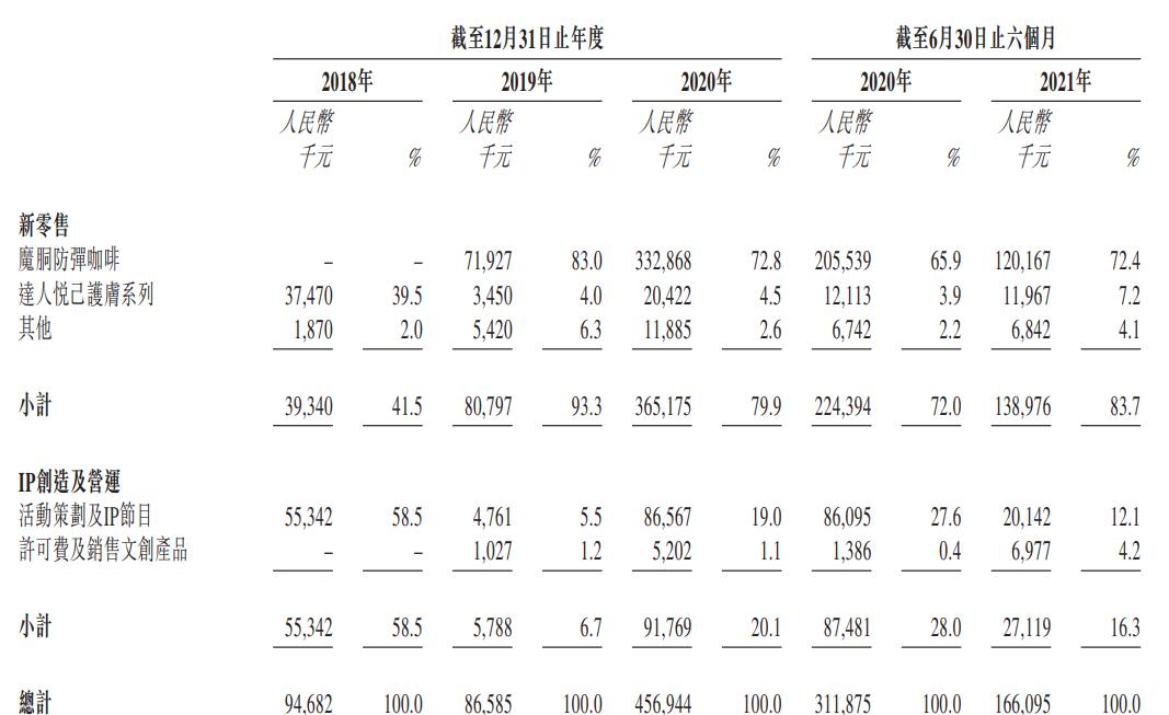 这是一家被称为“周杰伦IP第一股”的公司,它有两大主营业务,一是新零售,卖减肥饮品( 魔胴防弹咖啡)、护肤品等产品;二是IP创造与运营,包括活动策划和IP节目、相关许可费和销售文创产品。
