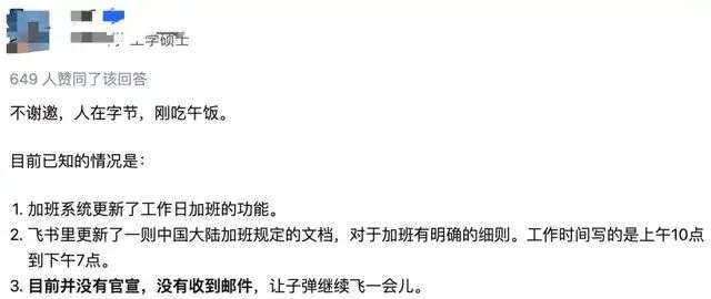经过考证之后,有多位字节跳动员工确认了以上更新内容的真实性,表示加班系统更新了工作日加班的功能,飞书也更新了一则中国大陆加班规定的文档,对于加班有明确的细则,工作时间也写的是上午10点到下午7点。