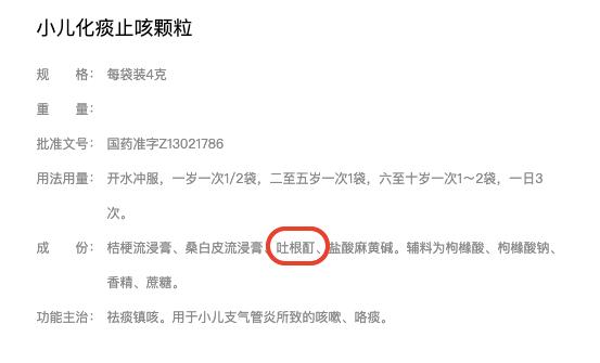 事实上,产自南美雨林的吐根植物比较适应南亚的潮热气候,我国广东、云南等地均有引种栽培。根据浙江省药品监督管理局,“很多祛痰止咳药中都用吐根酊为原料”,“除了临床上广泛使用的小儿化痰止咳颗粒,吐根酊还用于小儿化痰止咳糖浆、复方枇杷糖浆及复方桔梗氯化铵口服溶液等镇咳祛痰药中”。
