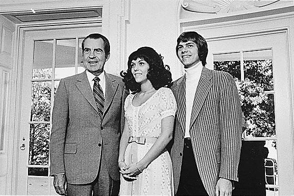 1972年卡彭特兄妹在白宫和前总统尼克松合影。图片来源:Robert L. Knudsen, 1972 (NARA)